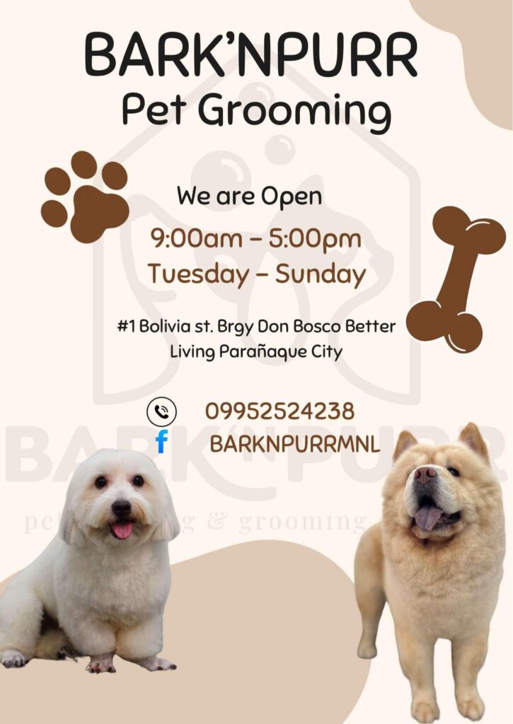 We are Open from Tuesday to Sunday Post author:Admin Post published:April 25, 2025 Post category:Uncategorized Post comments:0 Comments Our off days are Mondays. Book your appointment now. And visit us soon! Please follow and like us: You Might Also Like Pet grooming photos April 19, 2025 Thank you for trusting Bark N Purr March 2, 2025 Before and after March 2, 2025 Leave a Reply Cancel replyYou must be logged in to post a comment.